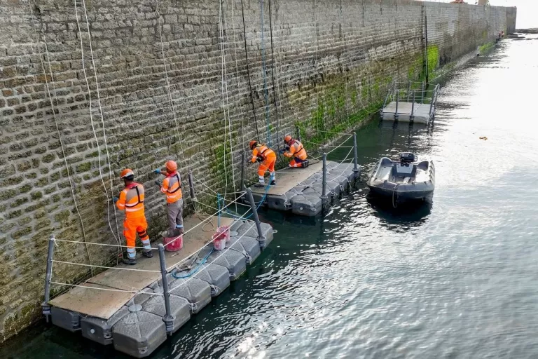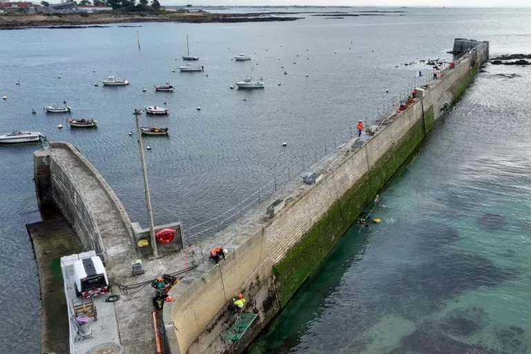Des scaphandriers professionnels sont également intervenus pour inspecter les parties immergées de l’ouvrage et réaliser des opérations de réparation directement sous l’eau. En parallèle, les joints entre les pierres de la digue ont été restaurés afin d’améliorer l’étanchéité et la solidité de l’ensemble.