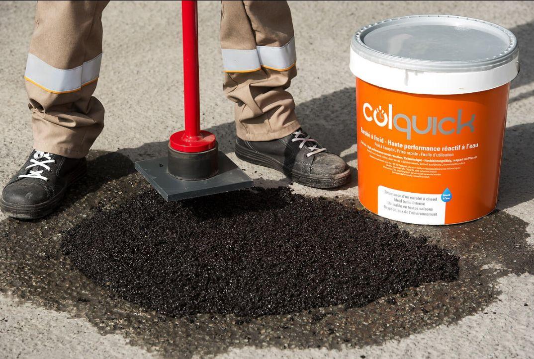 - Des solutions conditionnées comme Colquick ou Compomac permettent de réparer facilement une chaussée, reboucher un trou ou corriger une dégradation localisée, sans équipement spécifique. Pratiques et rapides à mettre en œuvre, ces enrobés à froid garantissent une adhérence immédiate et une résistance durable, même sur des zones à fort passage.